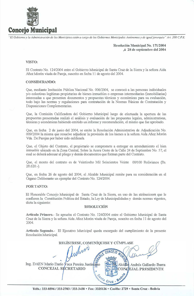 Se aprueba el Contrato No. 124/2004 entre el Gobierno Municipal de Santa Cruz de la Sierra y la señora Aida Añez Morón viuda de Pareja , suscrito en fecha 11 de agosto del 2004.