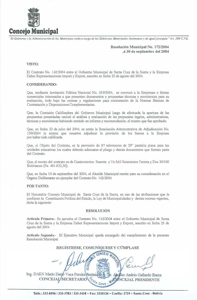 Se aprueba el Contrato No. 142/2004 entre el Gobierno Municipal de Santa Cruz de la Sierra y la Empresa Daher representaciones Import y Export, suscrito en fecha 23 de agosto del 2004.