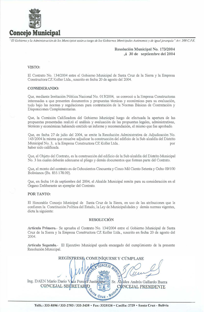 Se aprueba el Contrato No. 134/2004 entre el Gobierno Municipal de Santa Cruz de la Sierra y la Empresa Constructora CZ Koller Ltda., suscrito en fecha 20 de agosto del 2004.