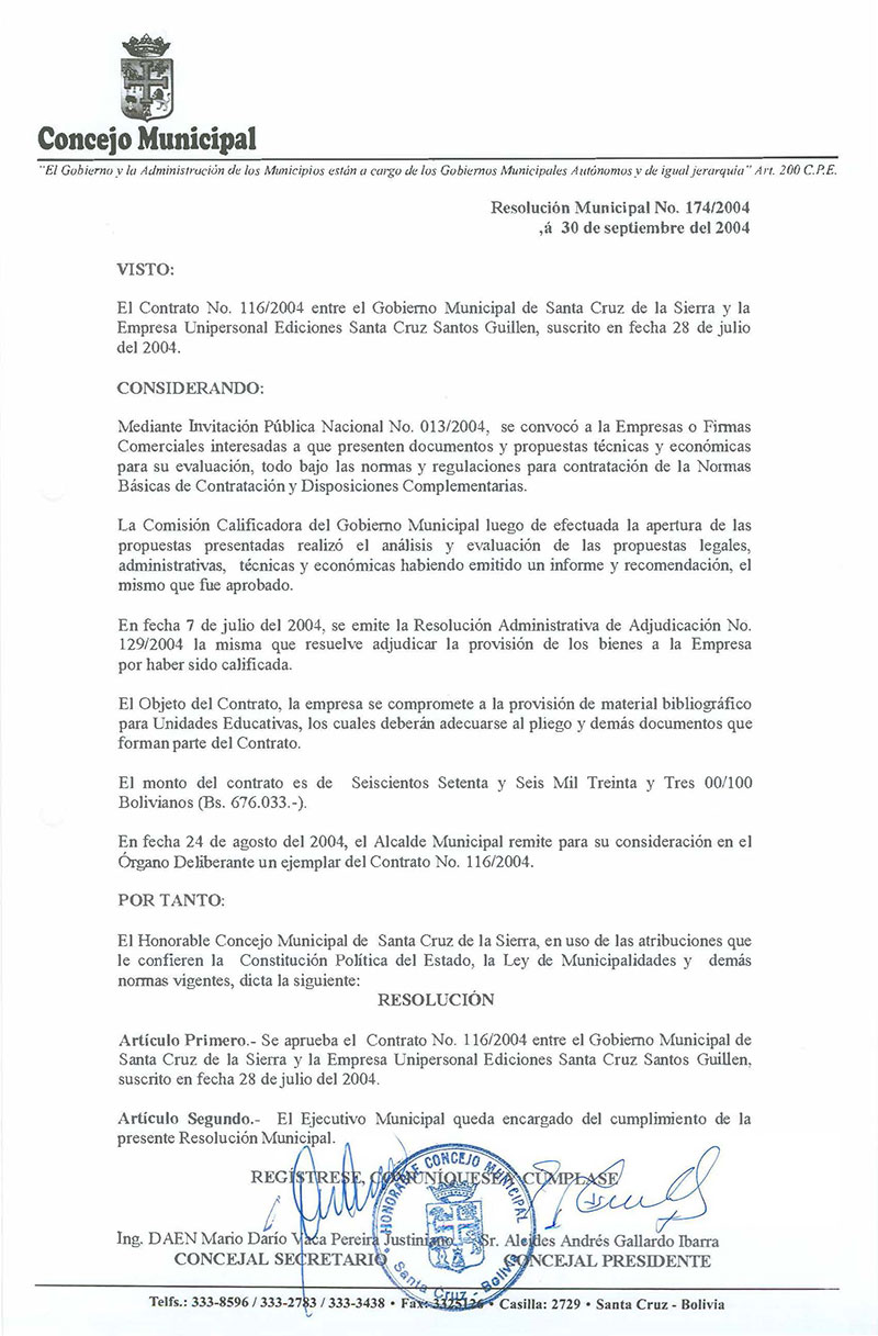 Se aprueba el Contrato No. 116/2004 entre el Gobierno Municipal de Santa Cruz de la Sierra y la Empresa Unipersonal Ediciones Santa Cruz Santos Guillen, suscrito en fecha 28 de julio del 2004.
