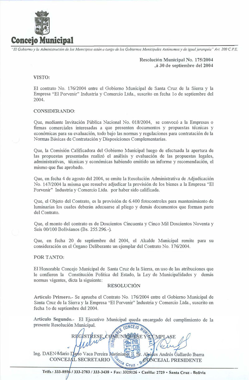 Se aprueba el Contrato No. 176/2004 entre el Gobierno Municipal de Santa Cruz de la Sierra y la Empresa "El Porvenir" Industria y Comercio Ltda., suscrito en fecha 01 de septiembre del 2004.