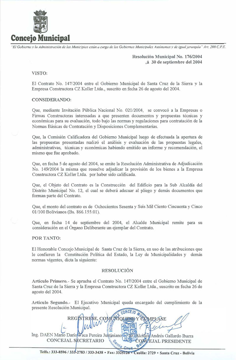 Se aprueba el contrato No. 147/2004 entre el Gobierno Municipal de Santa Cruz de la Sierra y la Empresa Constructora CZ Koller Ltda., suscrito en fecha 26 de agosto del 2004.