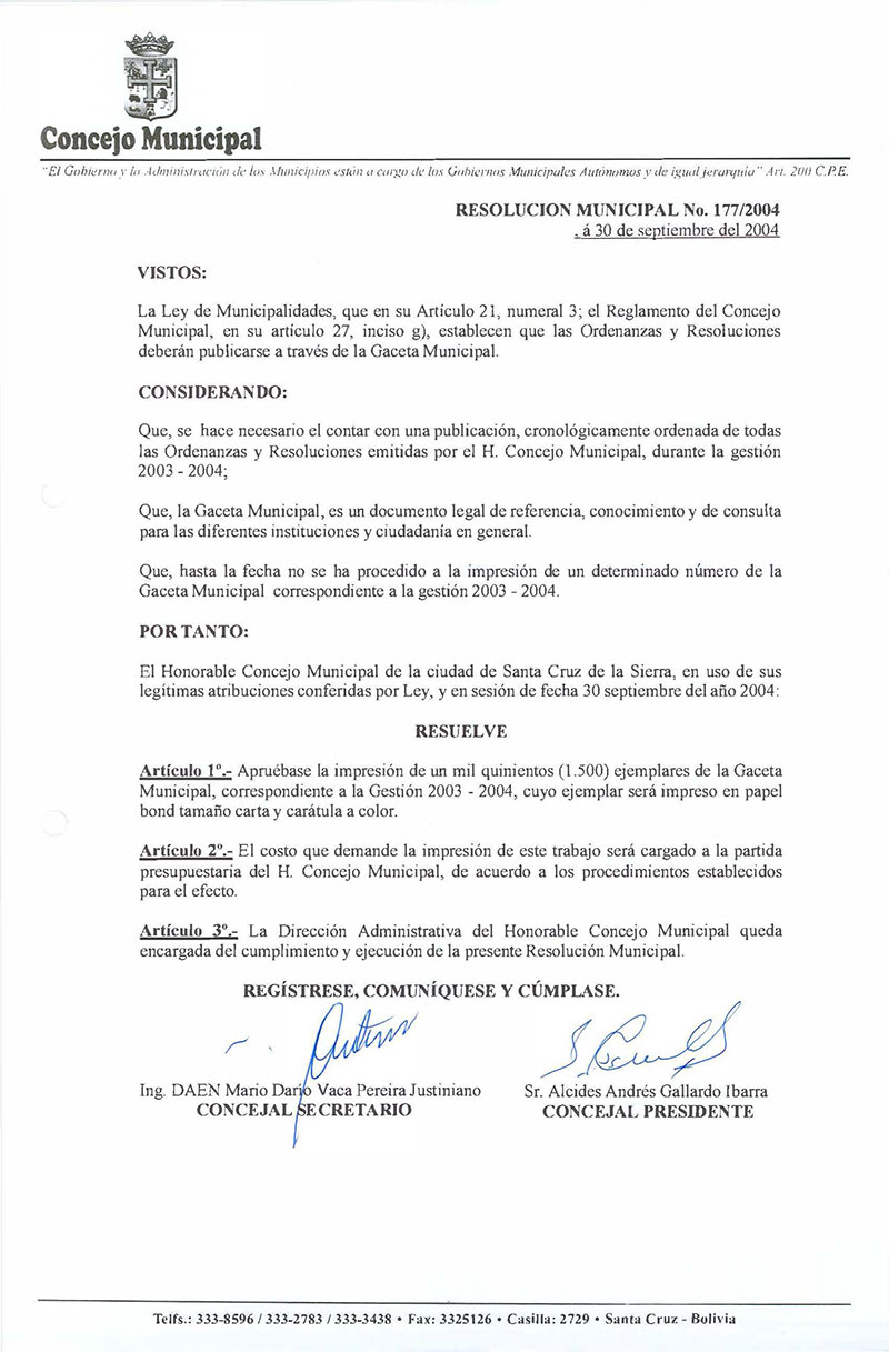 Apruébase la impresión de un mil quinientos (1.500) ejemplares de la Gaceta Municipal , correspondiente a la Gestión 2003 -2004, cuyo ejemplar será impreso en papel bond tamaño carta y carátula a color.