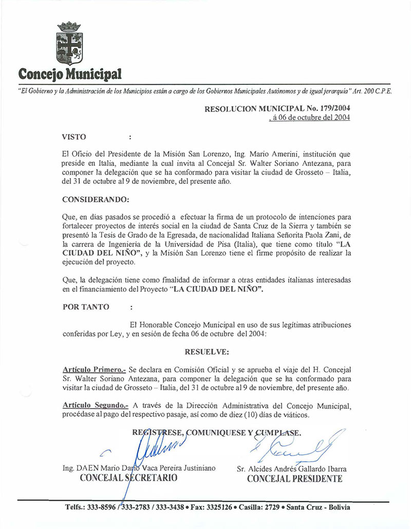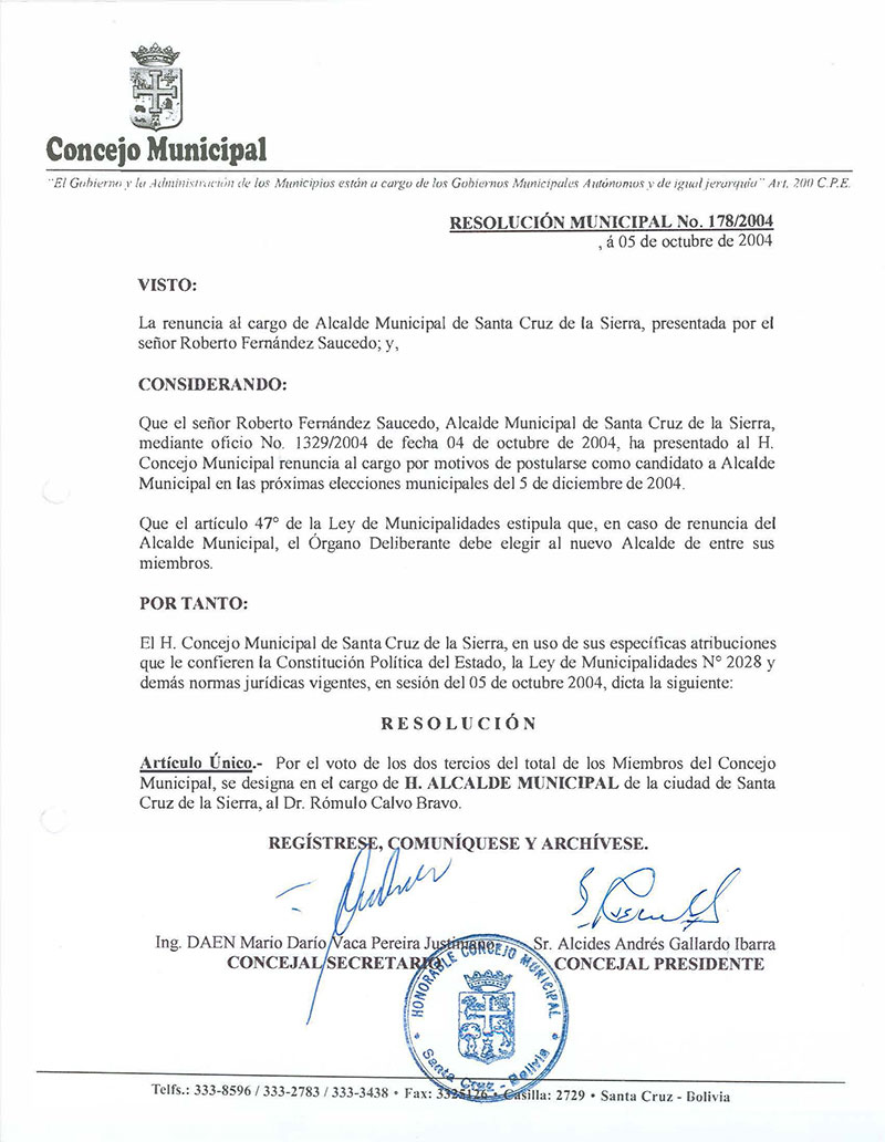 Por el voto de los dos tercios del total de los miembros del Concejo Municipal , se designa en el cargo de H. Alcalde Municipal de la ciudad de Santa Cruz de la Sierra, al Dr. Rómulo Calvo Bravo.