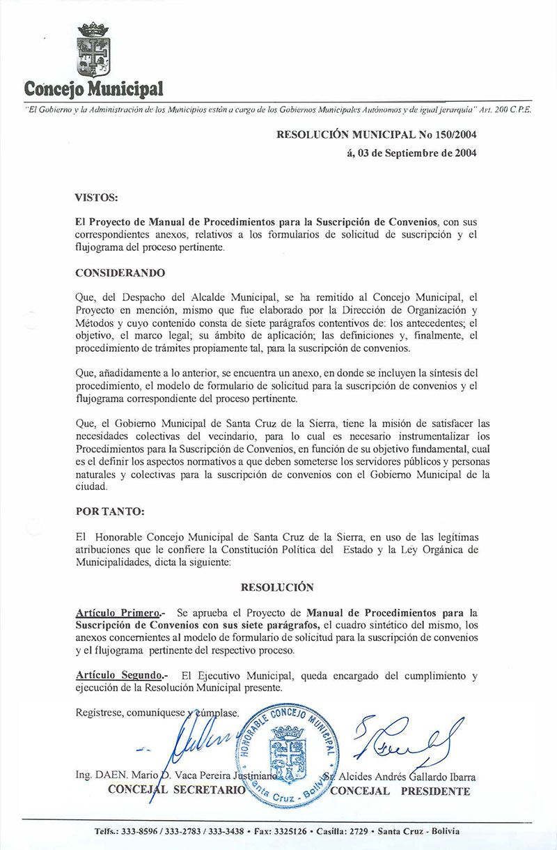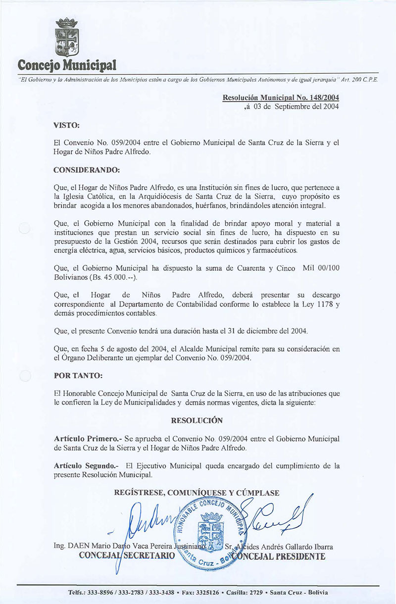 Se aprueba el Convenio No. 059/2004 entre el Gobierno Municipal de Santa Cruz de la Sierra y el Hogar de Niños Padre Alfredo.