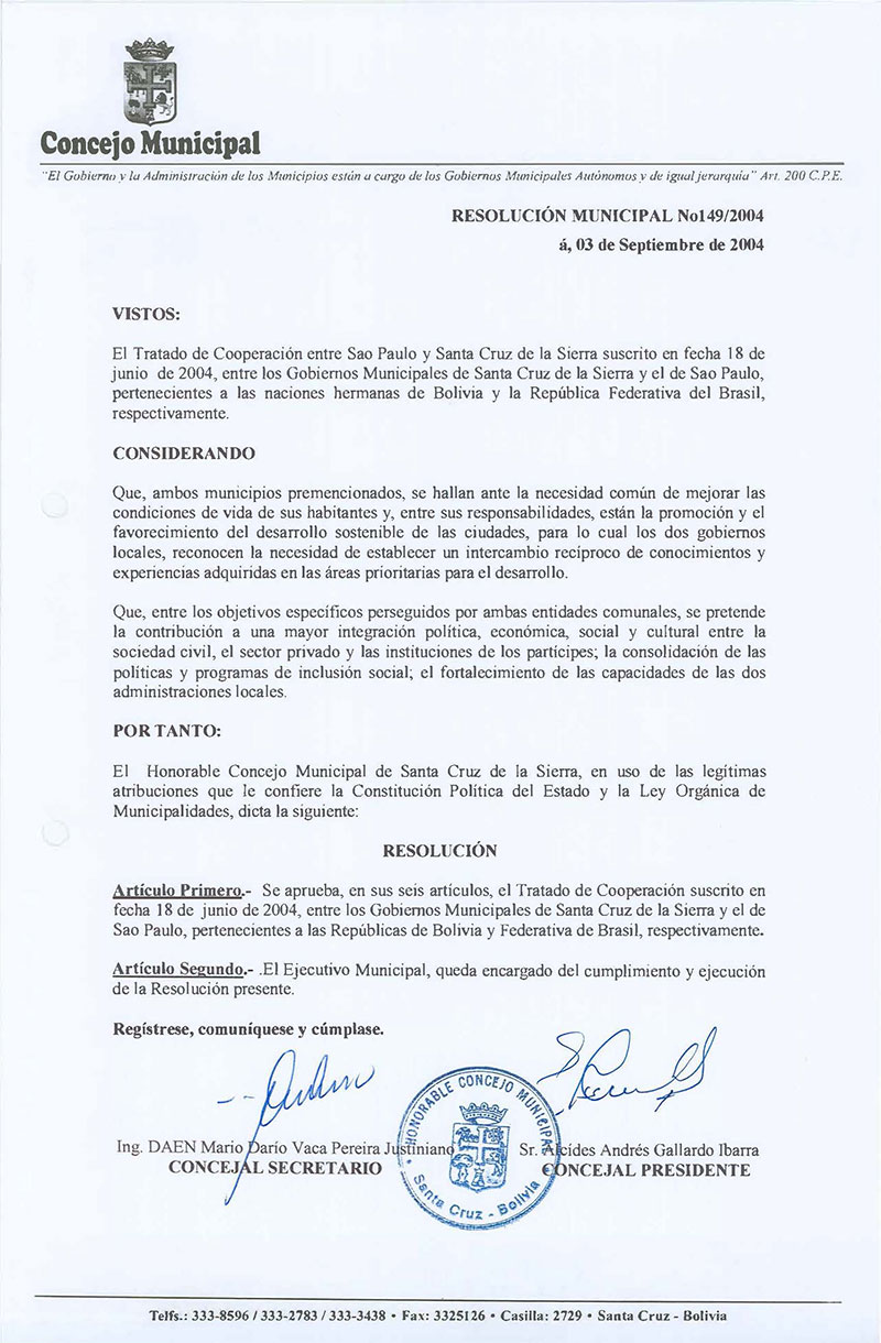Se aprueba , en sus seis artículos , el Tratado de Cooperación suscrito en fecha 18 de junio de 2004, entre los Gobiernos Municipales de Santa Cruz de la Sierra y el de Sao Paulo, pertenecientes a las Repúblicas de Bolivia y Federativa del Brasil, respectivamente.