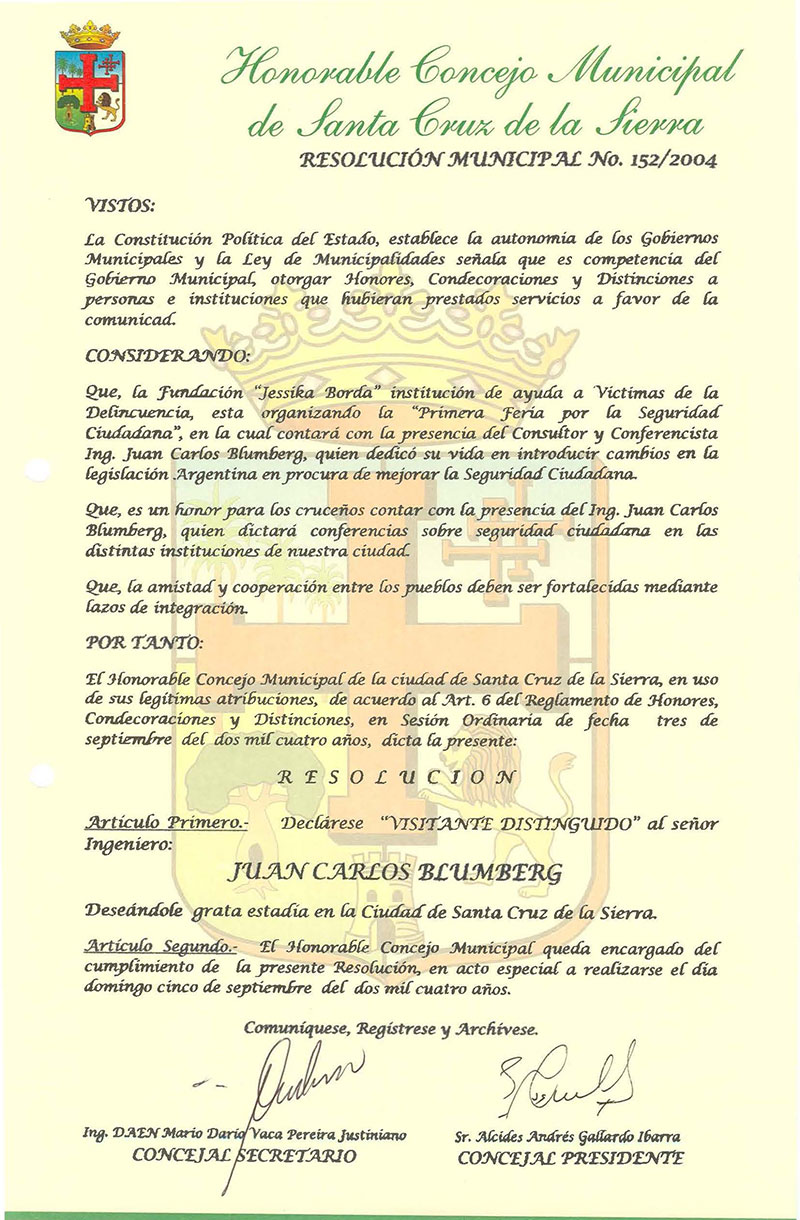 Declára "Visitante Distinguido" al Señor Ingeniero: Juan Carlos Blumberg, deseándole grata estadía en la ciudad de Santa Cruz de la Sierra.