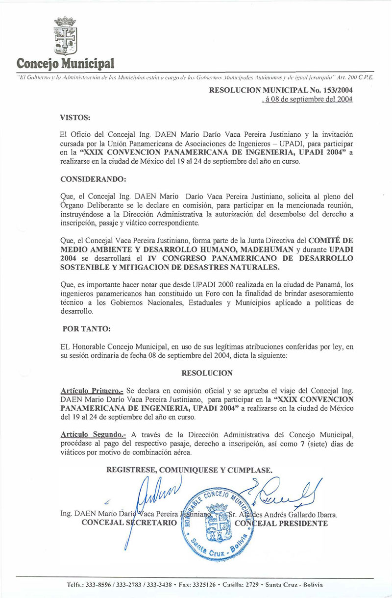 Declara en Comisión Oficial y se aprueba el viaje del Concejal Ing. DAEN Marío Darío Vaca Pereira Justiniano, para participar en la "XXIX Convención Panamericana de Ingeniería, UPADI 2004" a realizarse en la ciudad de México del 19 al 24 de septiembre.