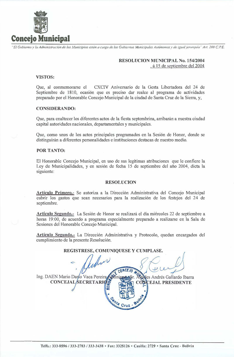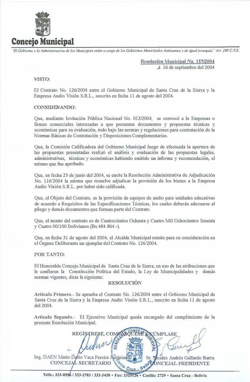 Aprueba el Contrato N° 126/2004 entre el Gobierno Municipal de Santa Cruz de la Sierra y la Empresa Audio Visión S. R. L, suscrito en fecha 11 de agosto del 2004.