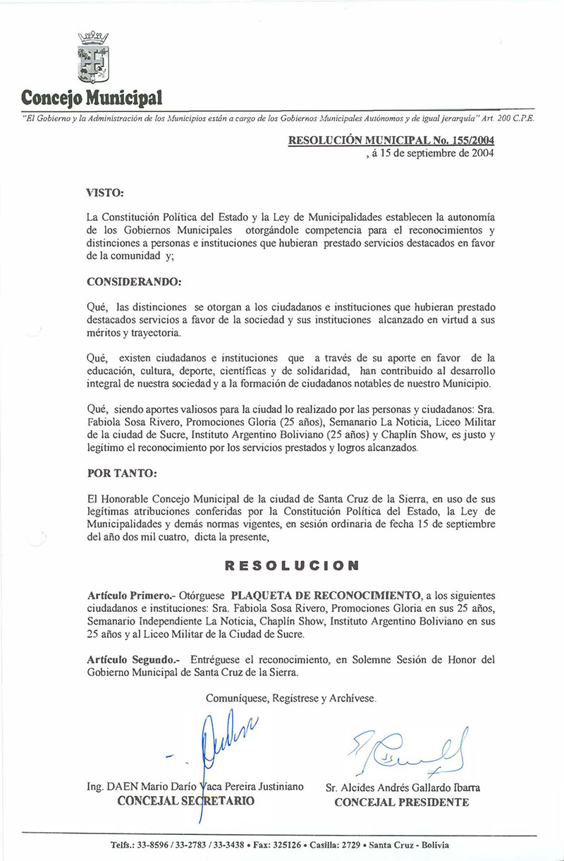 Otorga Plaqueta de Reconocimiento, a ciudadanos e instituciones, Sra. Fabiola Sosa RiVero, Promociones Gloria en sus 25 años, Semanario Independiente La Noticia, Chaplin Show, Instituto Argentino boliviano en sus 25 años y al Liceo Militar de la ciudad de Sucre.
