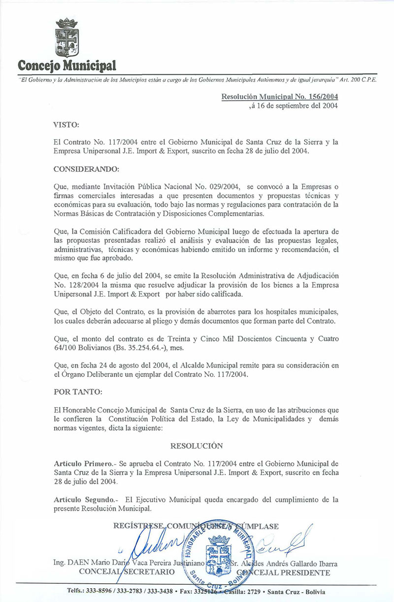 Aprueba el Contrato N° 117/2004 entre el Gobierno Municipal de Santa Cruz de la Sierra y la Empresa Unipersonal J.E Import.