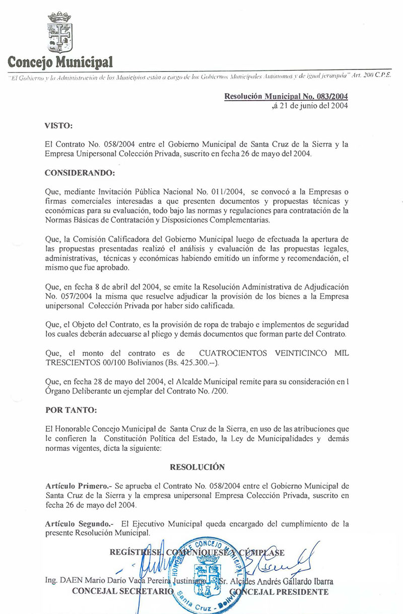 Se aprueba el Contrato Nº 58/2004 entre el Gobierno Municipal de Santa Cruz de la Sierra y la Empresa Colección Privada, suscrito en fecha 26 de mayo del 2004.