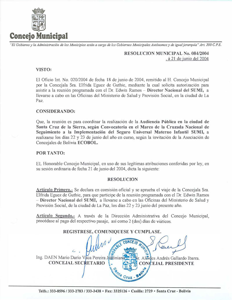 Se declara en comisión oficial y se aprueba el viaje de la Concejala Sra. Elfrida Eguez de Guthrié, para que participe de la reunión programada con el Dr. Edwin Ramos - Director Nacional del SUMI, a llevarse a cabo en las Oficinas del Ministerio de Salud y Previsión Social, de la ciudad de La Paz, los días 22 y 23 de junio del presente año.