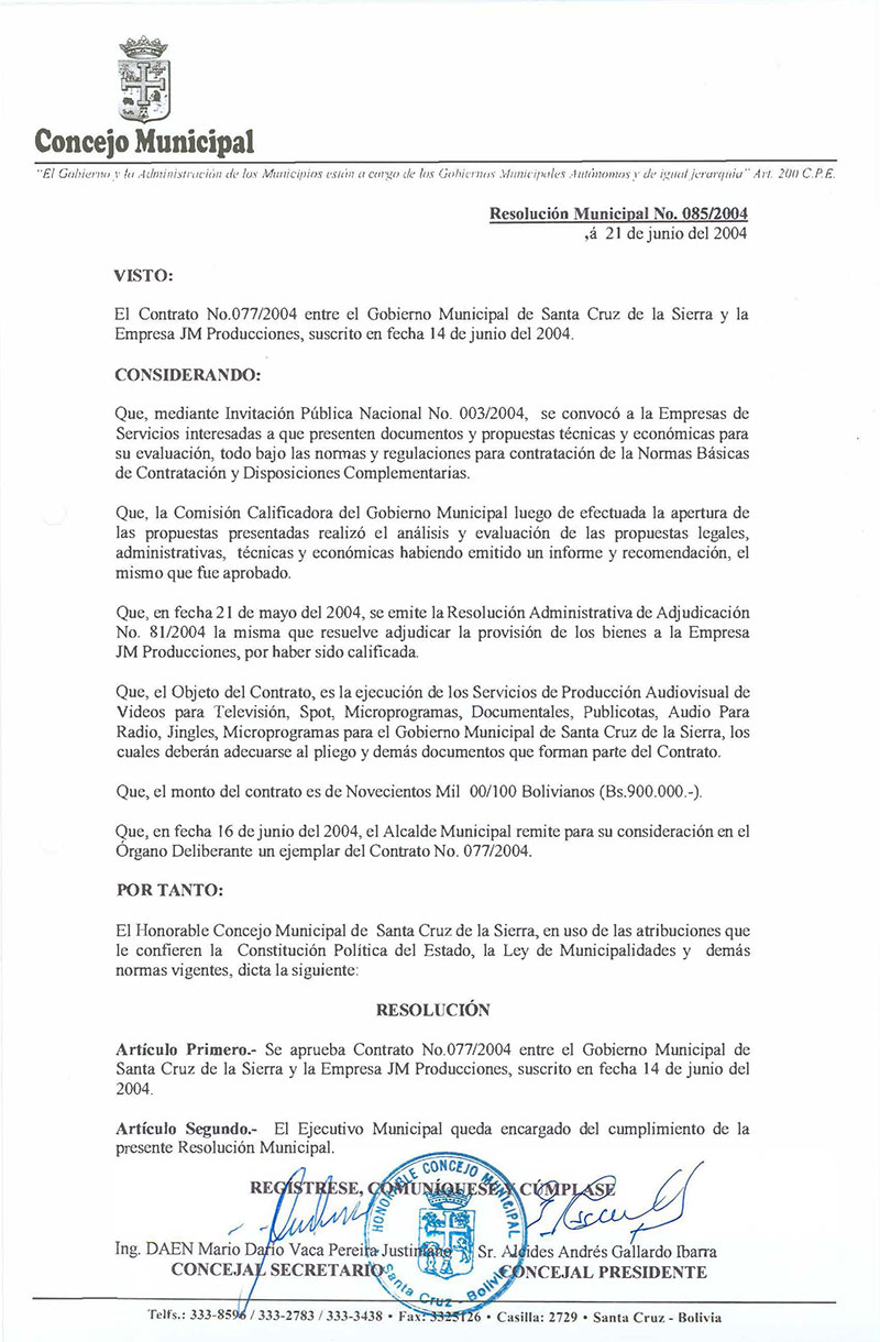 Aprueba el Contrato Nº 077/2004 entre el Gobierno Municipal de Santa Cruz de la Sierra y la Empresa JM Producciones, suscrito en fecha 14 de junio del 2004.