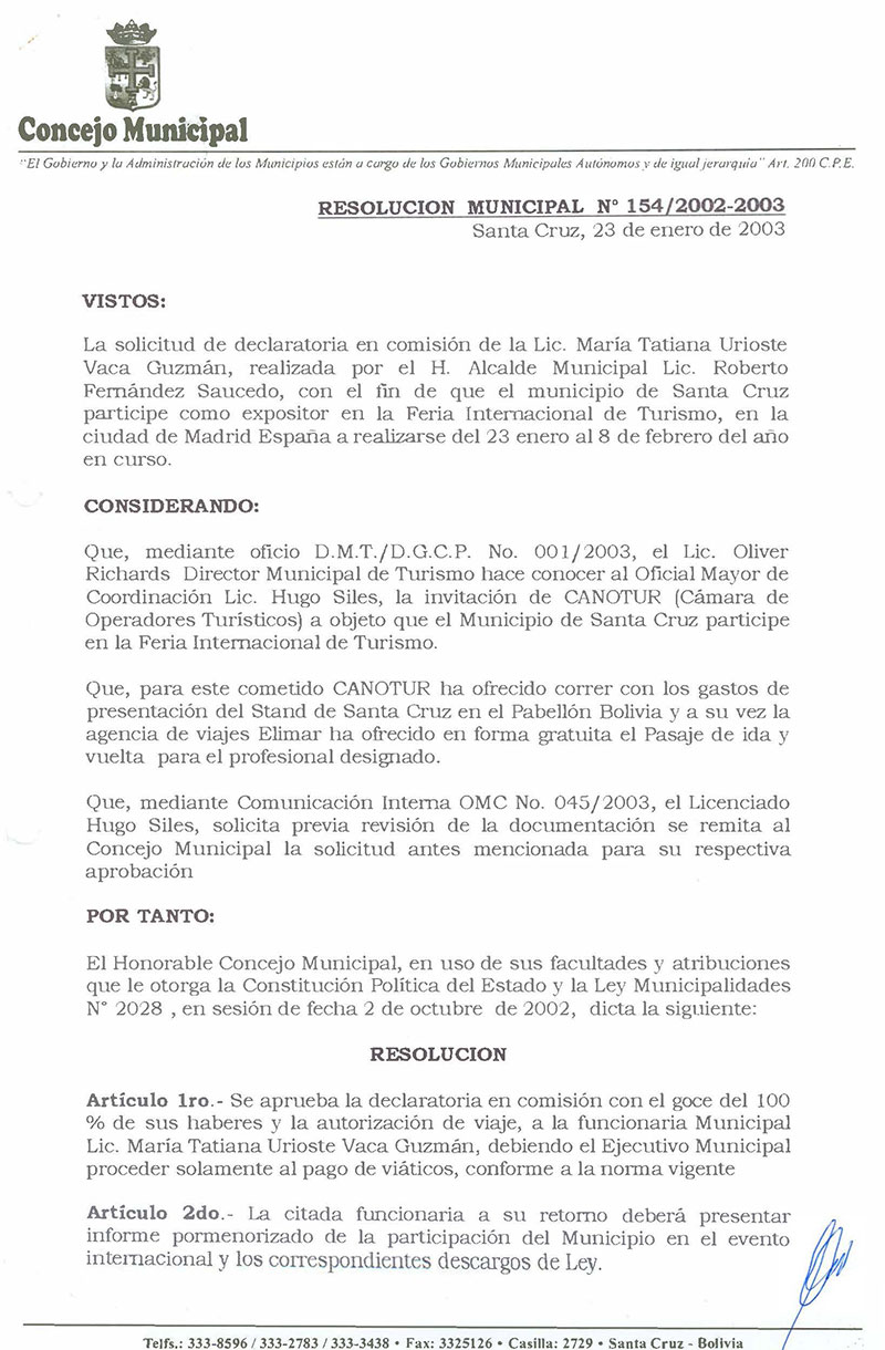 Aprueba la declaratoria en Comisión con el goce del 100 % de sus haberes y la autorización de viaje de la Funcionaria Municipal Lic. María Tatiana Urioste Vaca Guzmán.
