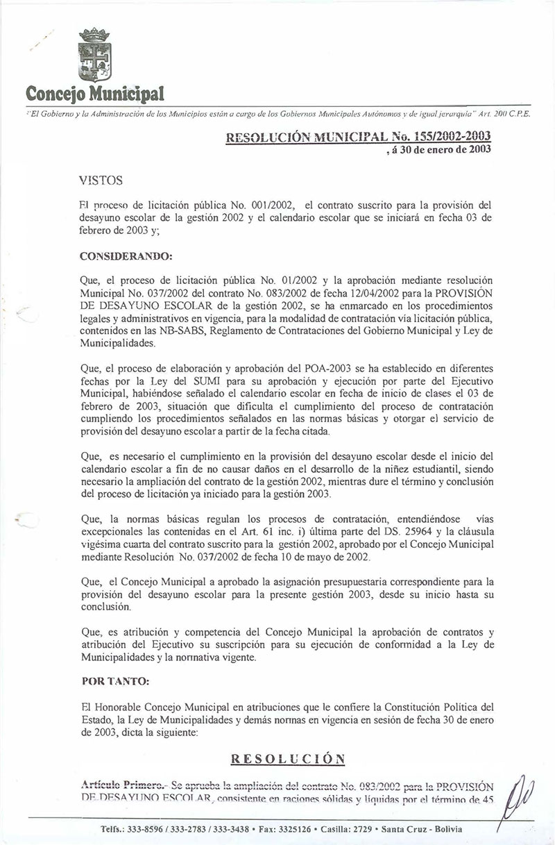Aprueba la Ampliación del Contrato No. 083/2002, para la provisión del desayuno escolar, por el término de 45 días hábiles, suscrito con la Empresa FAGAL S.R.L.