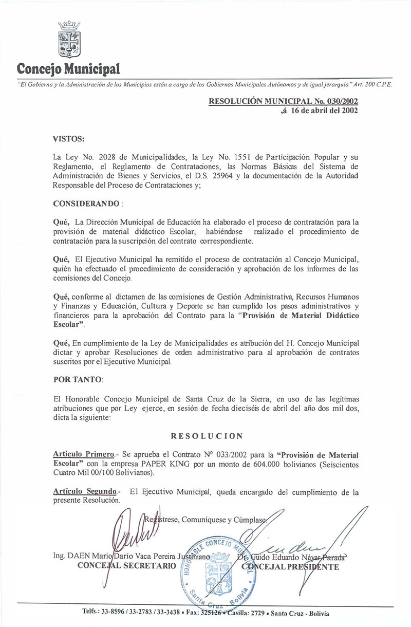 Aprueba el Contrato No. 033/2002 para la provisión de material escolar. Con la Empresa PAPER KING.