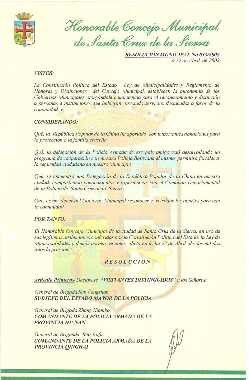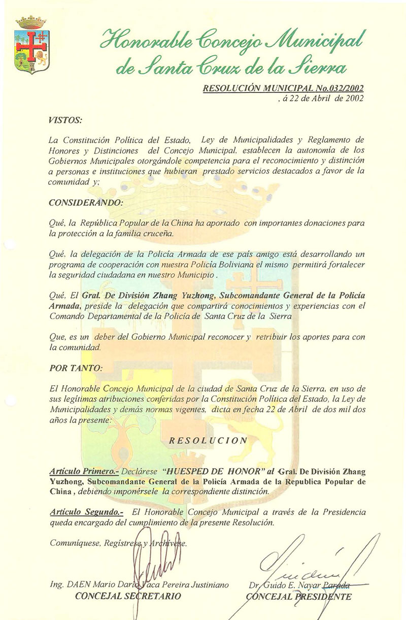Se declara huésped de honor al Gral. De División Zhang Yuzhong, Subcomandante General de la Policía Armada de la República Popular de China.