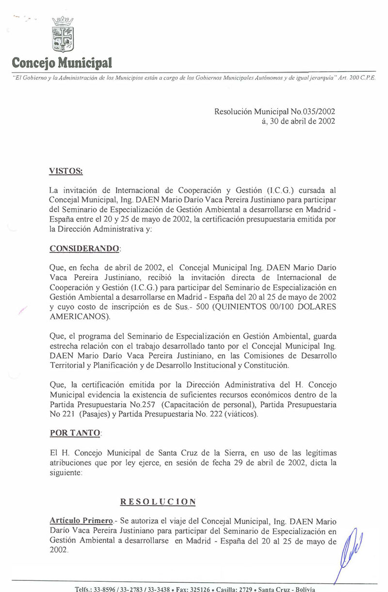 Autoriza el viaje del Concejal Ing.DAEN Mario Darío Vaca Pereira Justiniano, a participar del Seminario de Especialización en Gestión Ambiental a desarrollarse en Madrid – España.