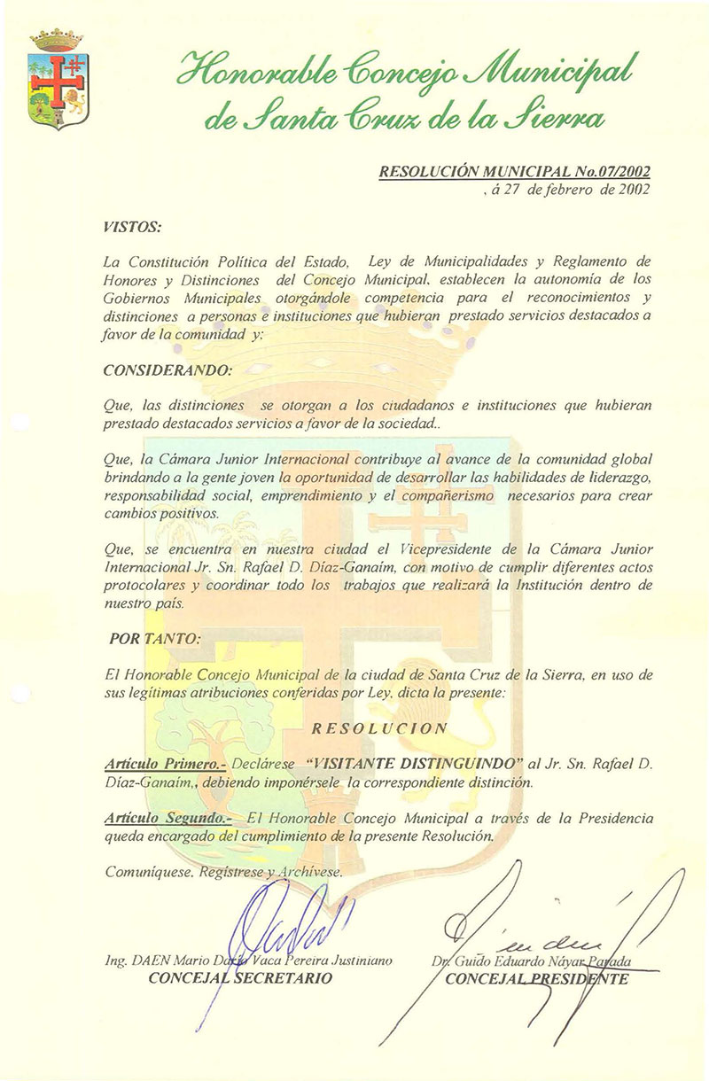 Declara Visitante Distinguido al Sr. Rafael D. Días – Ganaím, Vice Presidente de la Cámara Junior Internacional.