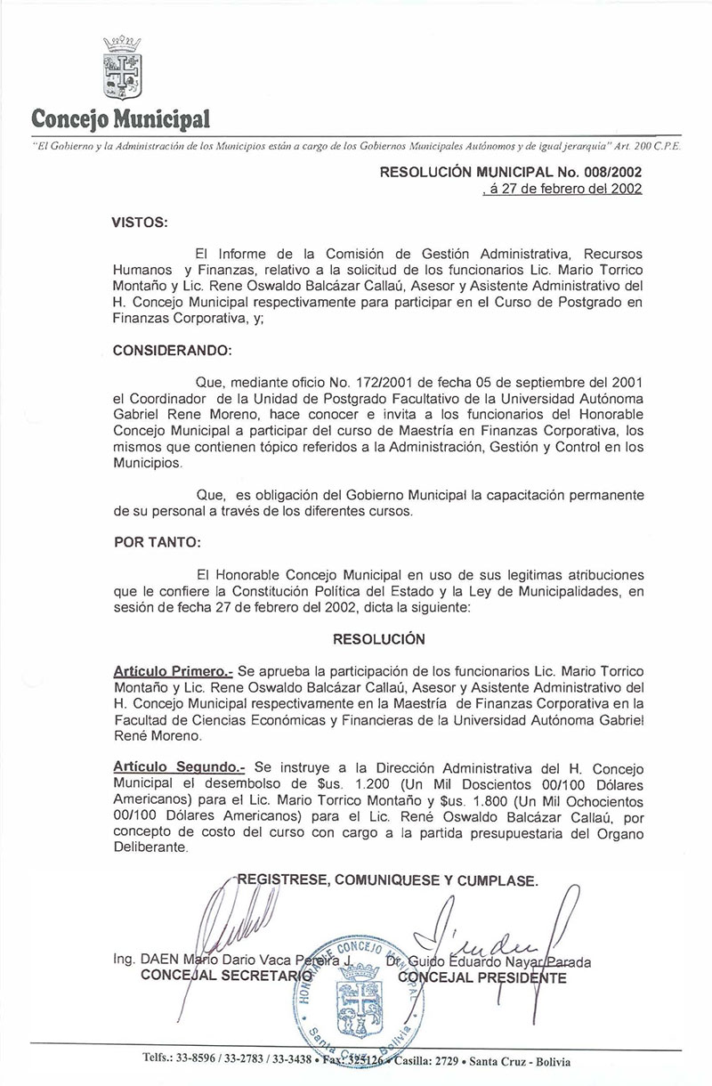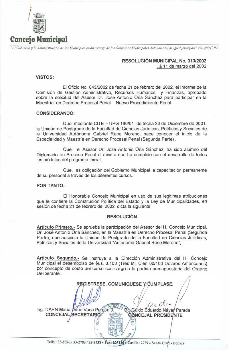 Aprueba la participación del Asesor del H. Consejo Municipal Dr. José Antonio Oña Sánchez, en la Maestría en Derecho Procesal Penal (Segunda Parte), que auspicia la Universidad Autónoma Gabriel René Moreno.