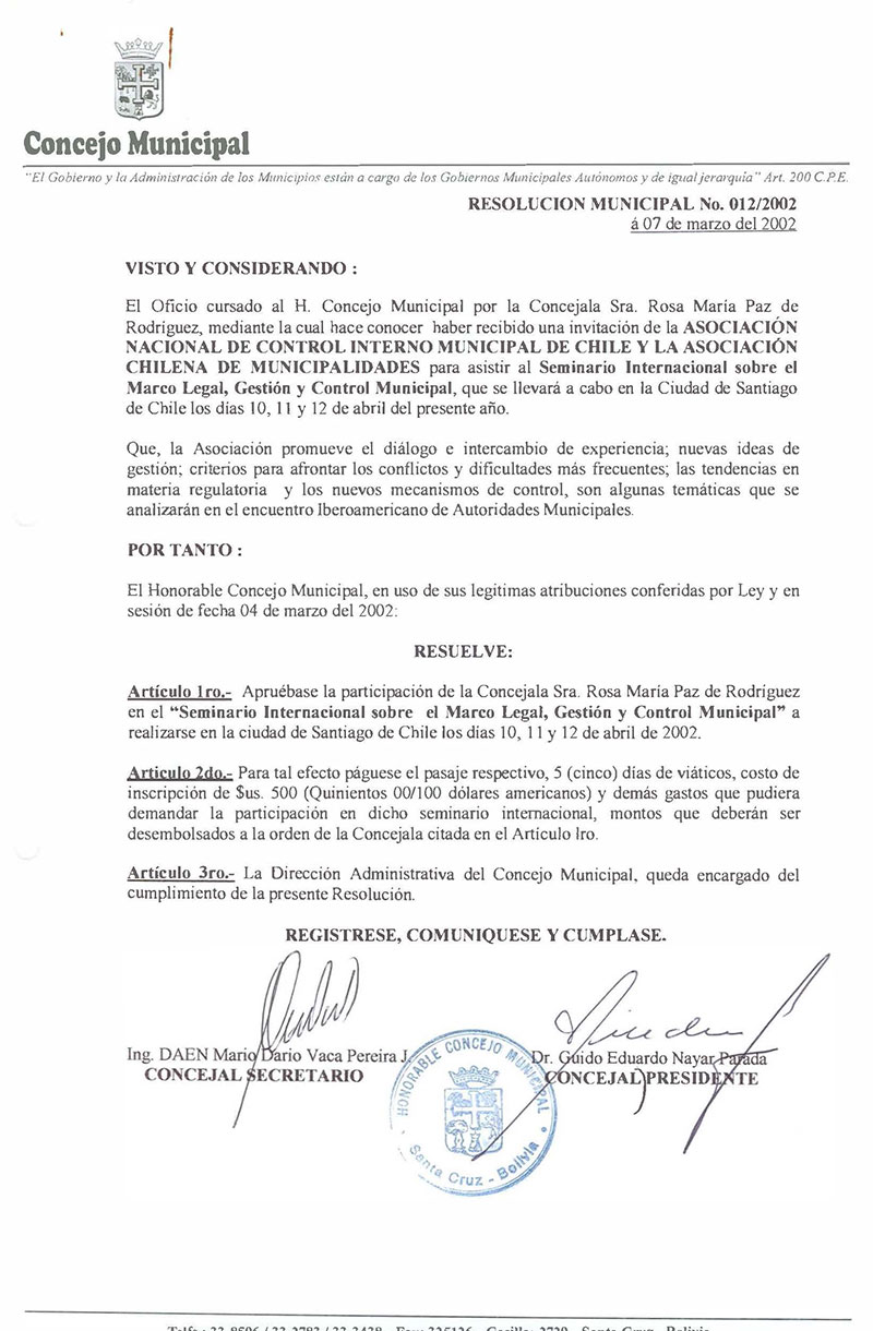 Aprueba la participación de la Concejala Sra. Rosa María Paz de Rodríguez en el Seminario Internacional sobre el Marco Legal, Gestión y Control Municipal, a realizarse en la Ciudad de Santiago de Chile los días 10, 11 y 12 de abril del 2002.
