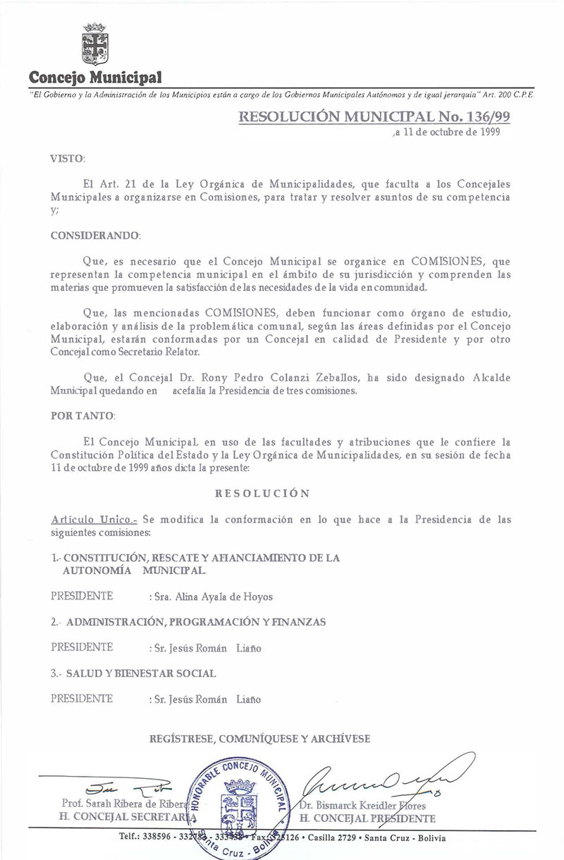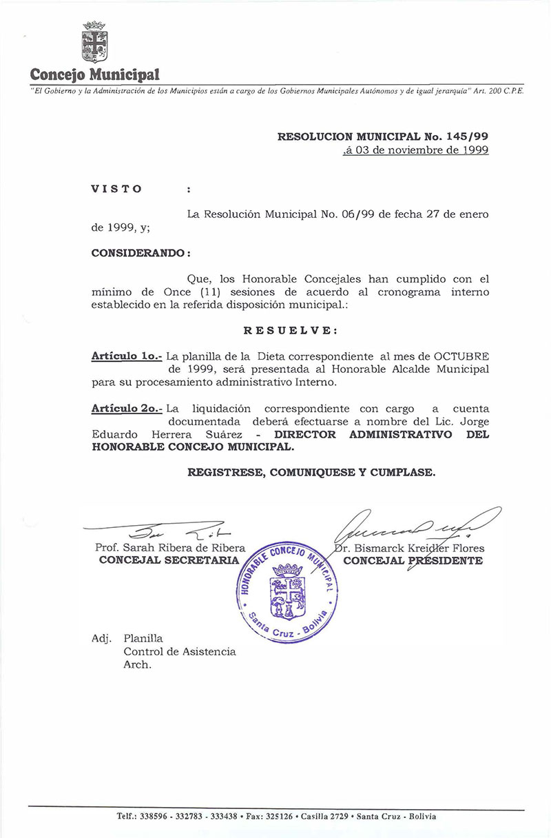 Modifica el Art. 2do. de la Resolución Municipal No. 008/99, referente al cambio de nombre del cheque del fondo rotatorio.