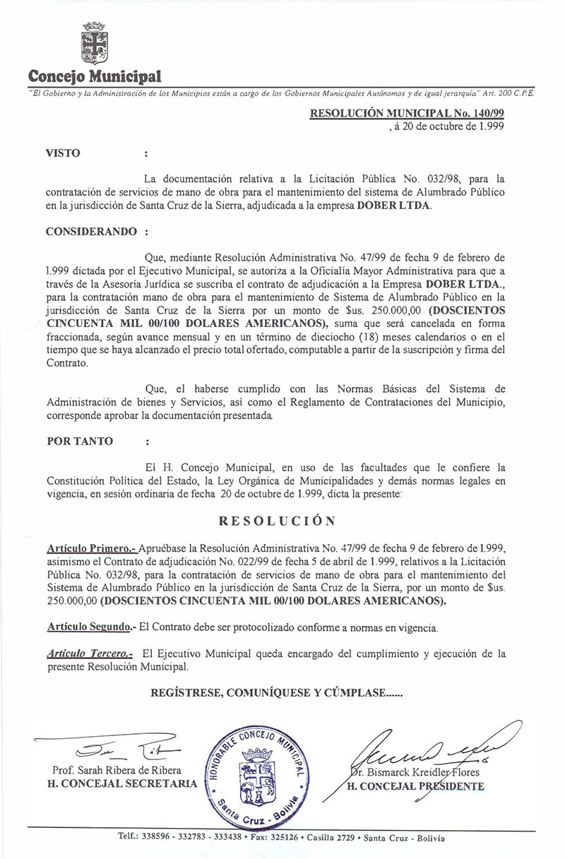 Aprueba en grado de revisión la Res. Adm. No. 47/99 y el Contrato 022/99, para la contratación de servicio de mano de obra para el mantenimiento del Sistema de Alumbrado Público, por el monto de $us. 250.000,00.