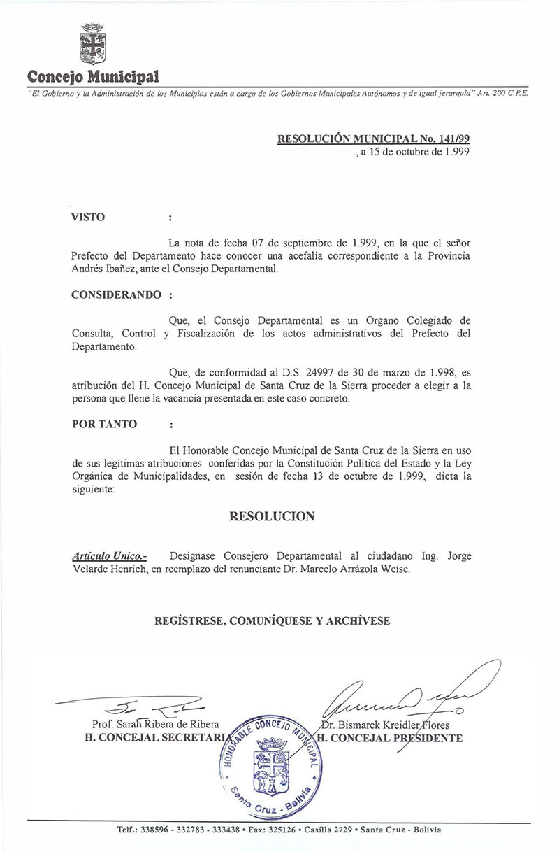 Designa Consejero Departamental al ciudadano Ing. Jorge Velarde Henrich, en reemplazo del renunciante Dr. Marcelo Arrázola Weise.
