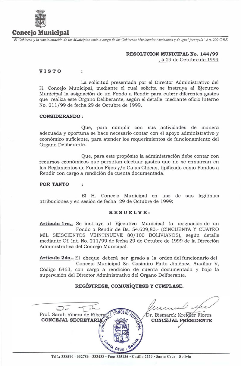 Instruye al Ejecutivo Municipal la asignación de un Fondo a Rendir de Bs. 54.629,80 Según detalle mediante OF. Int. N° 211/99 de la Dirección de Administración.