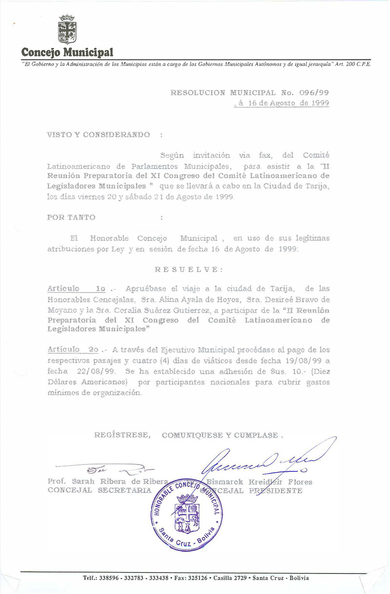 Aprueba el viaje a la ciudad de Tarija de las Concejales: Alina Ayala de Hoyos, Desirée Bravo y Coralia Suárez, a participar de la “II REUNION PREPARATORIA DEL XI CONGRESO DEL COMITÉ LATINOAMERICANO DE LEGISLADORES MUNICIPALES.