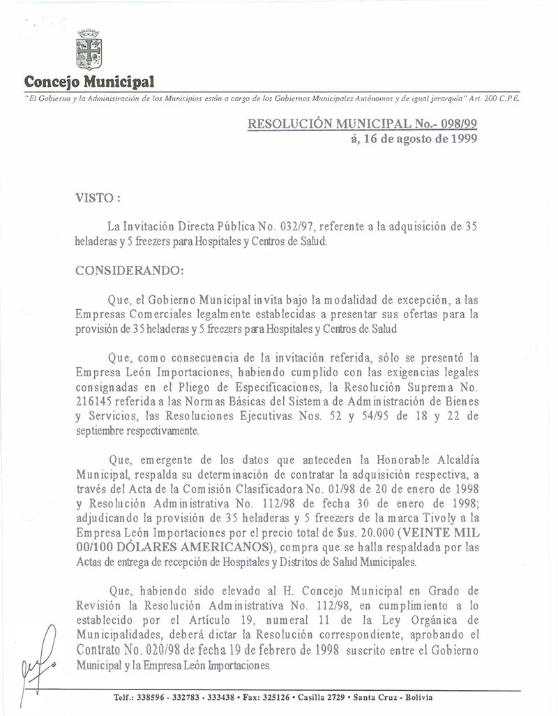 Aprueba la Res. Adm. No. 112/98 y el Contrato No. 020/98, suscrito entre el Gobierno Municipal y la Empresa Importadora León Importaciones, adjudicación de 35 heladeras y 5 freezers $us. 20.000.