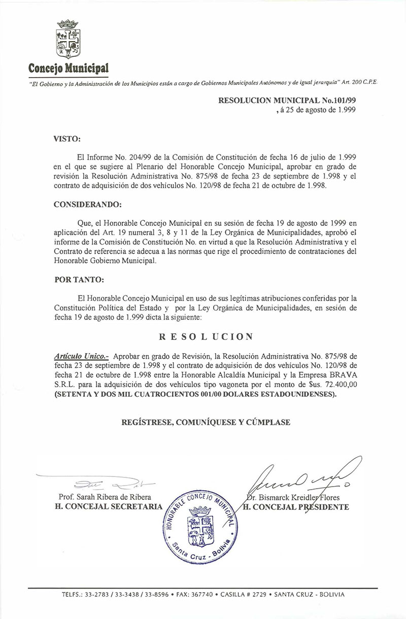 Aprueba en grado de revisión la Res. Adm. No. 875/98 y el Contrato No. 120/98, suscrito entre el Gobierno Municipal y la Empresa BRAVA S.R.L., adjudicación de dos vehículos tipo vagoneta por el monto de $us. 72.400.