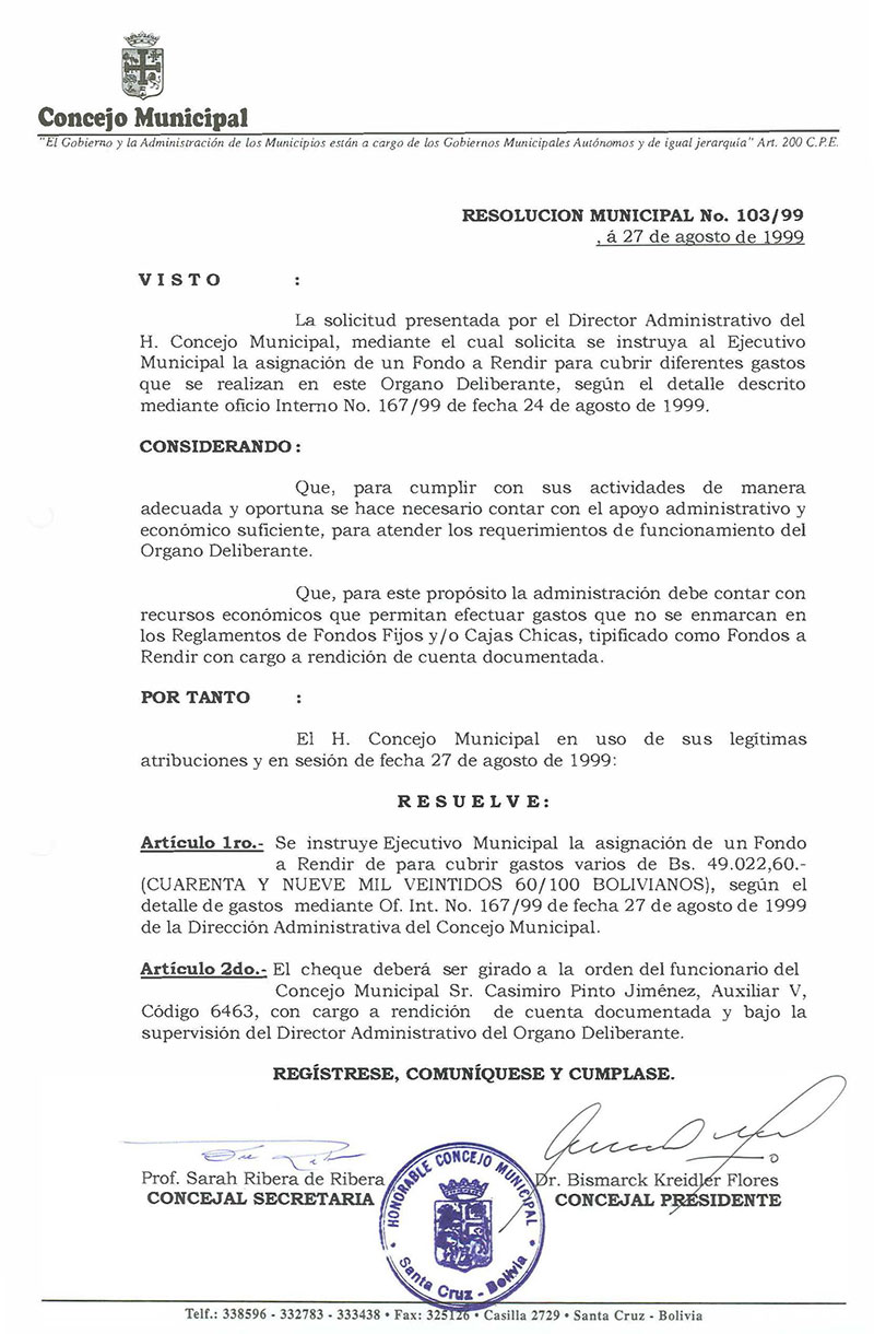 Instruye al Ejecutivo Municipal la asignación de un Fondo a Rendir de Bs. 49.022,60 según el detalle de gastos mediante OF. InT. N° 167/99.