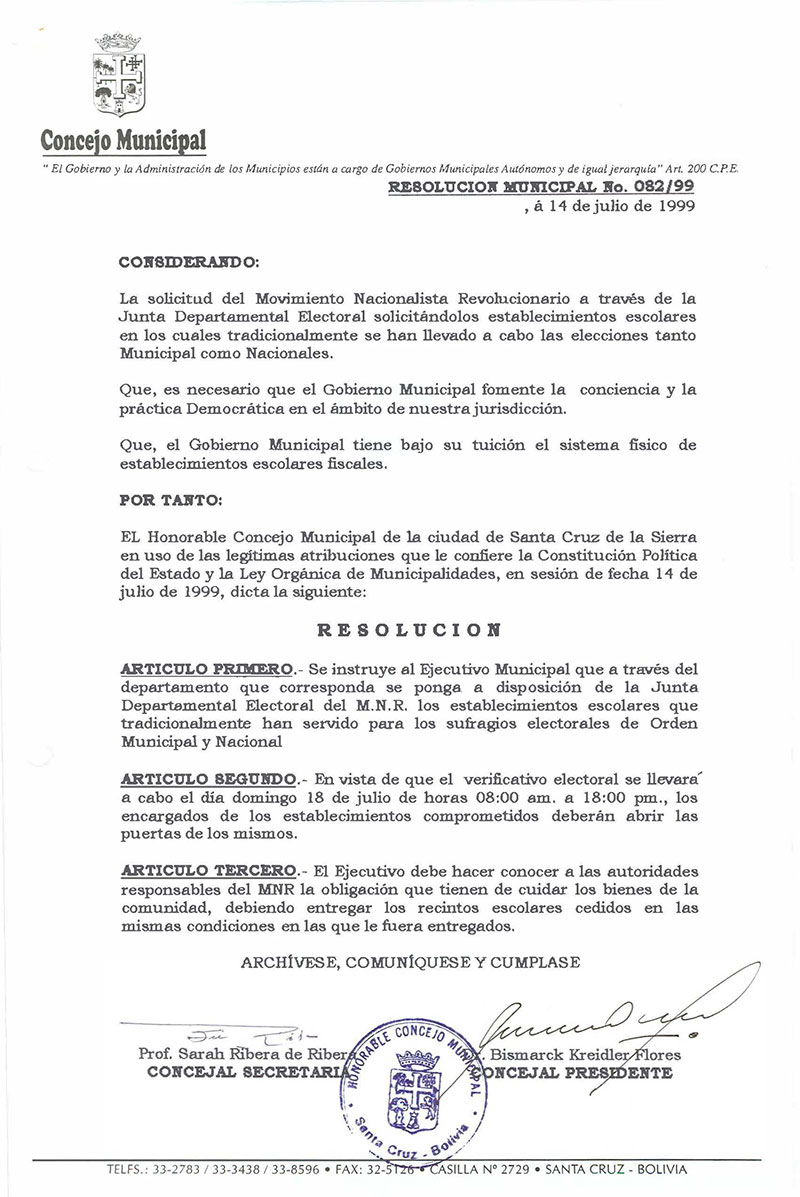 Instruye al Ejecutivo Municipal que a través del departamento que corresponda se ponga a disposición de la Junta Departamental Electoral del M.N.R. los establecimientos escolares.