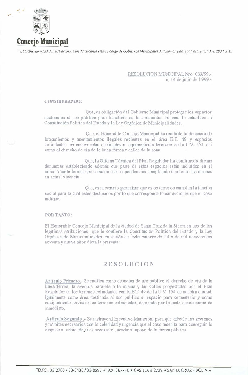 Ratifica como espacios de uso público el derecho de vía de la línea férrea, la avenida paralela a la misma y las calles proyectada por el Plan Regulador en los terrenos colindantes con la E.T. 49 de la U.V. 154.