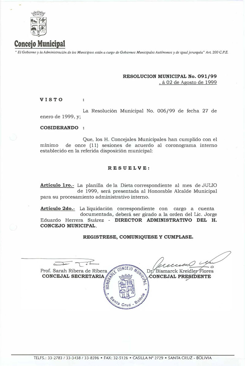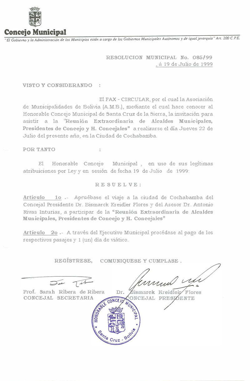 El Concejo Municipal de la ciudad de Santa Cruz de la Sierra decide la afiliación del Gobierno Municipal de Santa Cruz a la Asociación de Municipios de Santa Cruz (AMDECRUZ).