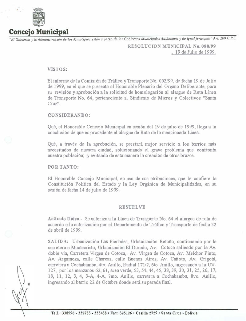 Autoriza a la línea de Transporte No. 64 el alargue de ruta de acuerdo a la autorización por el Departamento de Tráfico y Transporte.