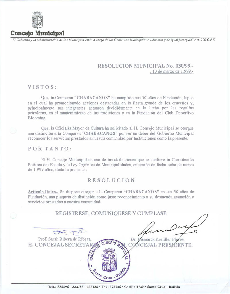 Dispone otorgar a la Comparsa “CHABACANOS”, en sus 50 años de Fundación una plaqueta de distinción.