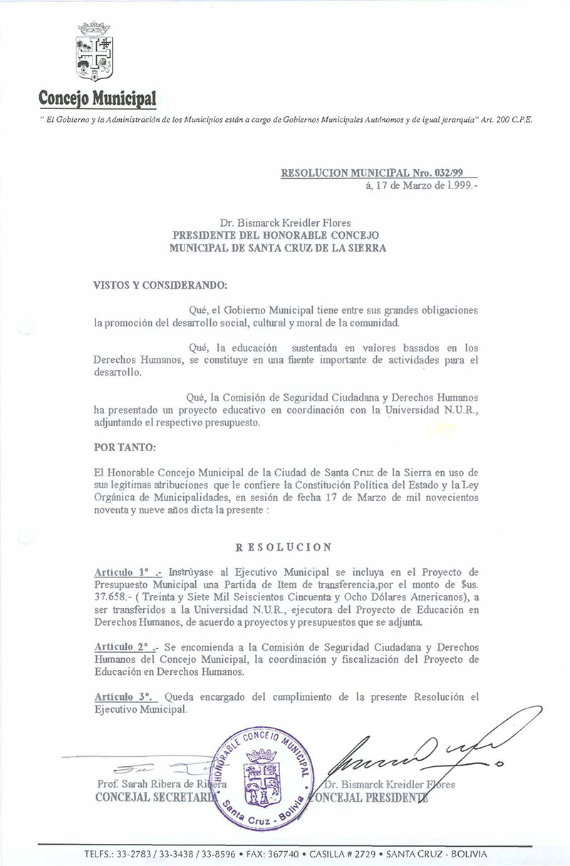 Instruye al Ejecutivo Municipal se incluya en el proyecto del Presupuesto Municipal una partida por el monto de $us. 37.658.-, a ser transferidos a la Universidad NUR para la ejecución del proyecto de Educación en Derechos Humanos.
