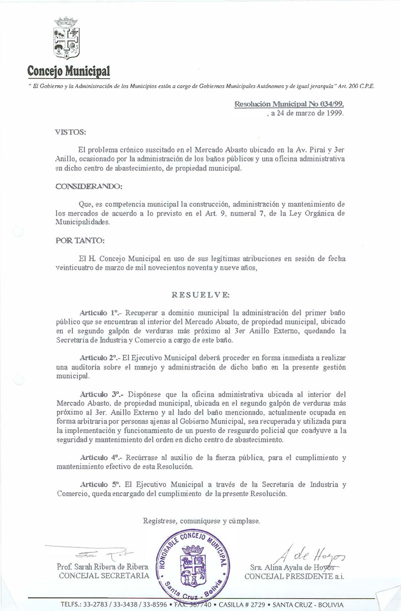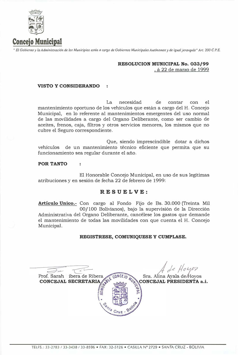 Con cargo al Fondo Fijo de Bs. 30.000.-, se cancele el mantenimiento de todas las movilidades que cuenta el H. Concejo Municipal.