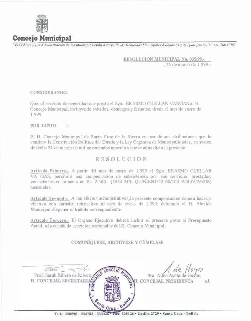 Dispone una compensación económica de Bs. 2.500.- en favor del Sgto. Erasmo Cuéllar Vargas a partir el mes de Enero/99.