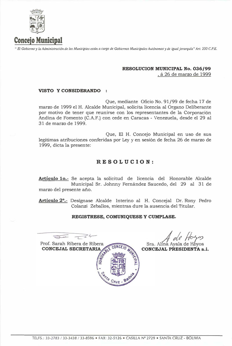 Concede licencia al Sr. Alcalde Municipal y designa Alcalde Interino al Concejal Rony Pedro Colanzi Zeballos mientras dure la ausencia del titular.