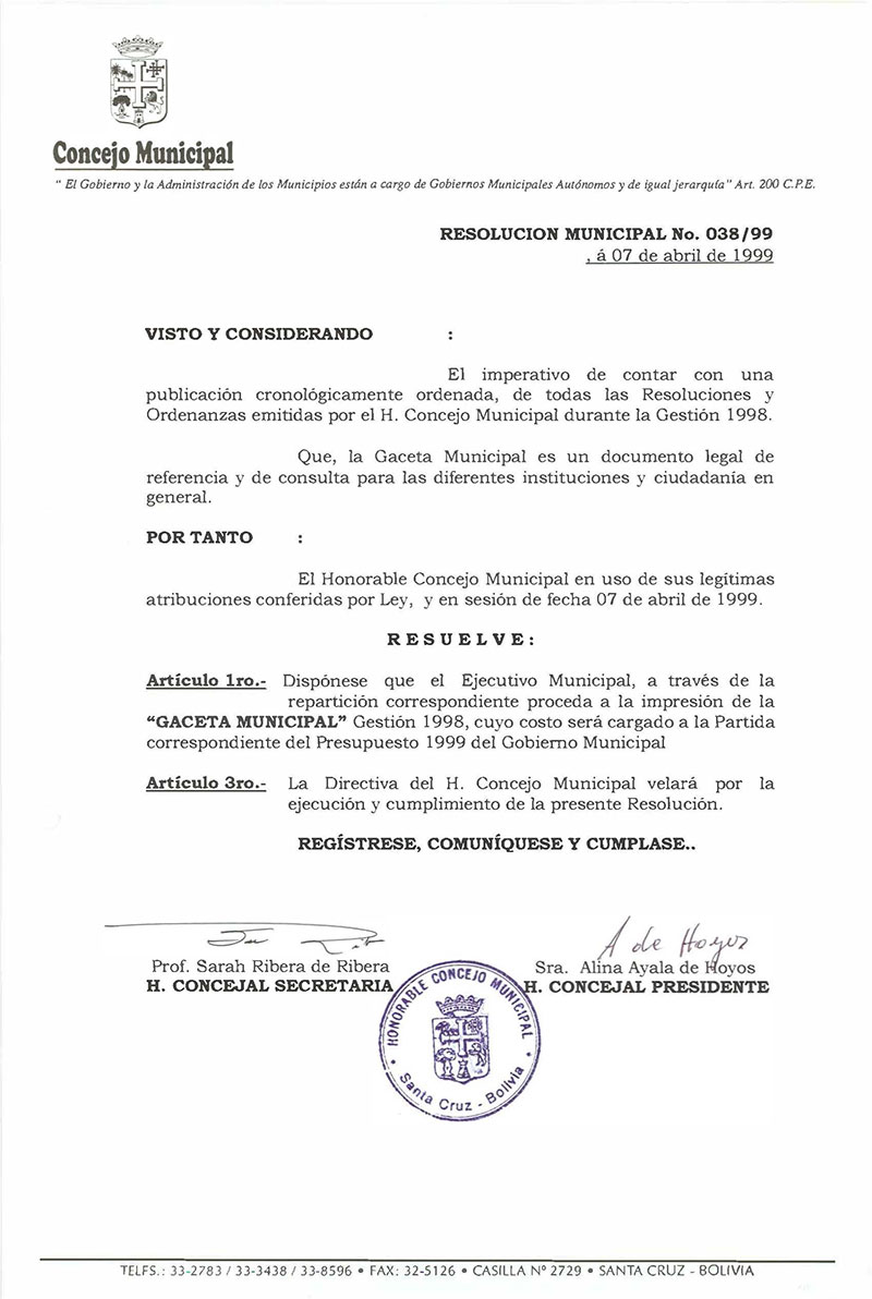 Dispone que el Ejecutivo Municipal, proceda a la impresión de la Gaceta Municipal Gestión 1998.