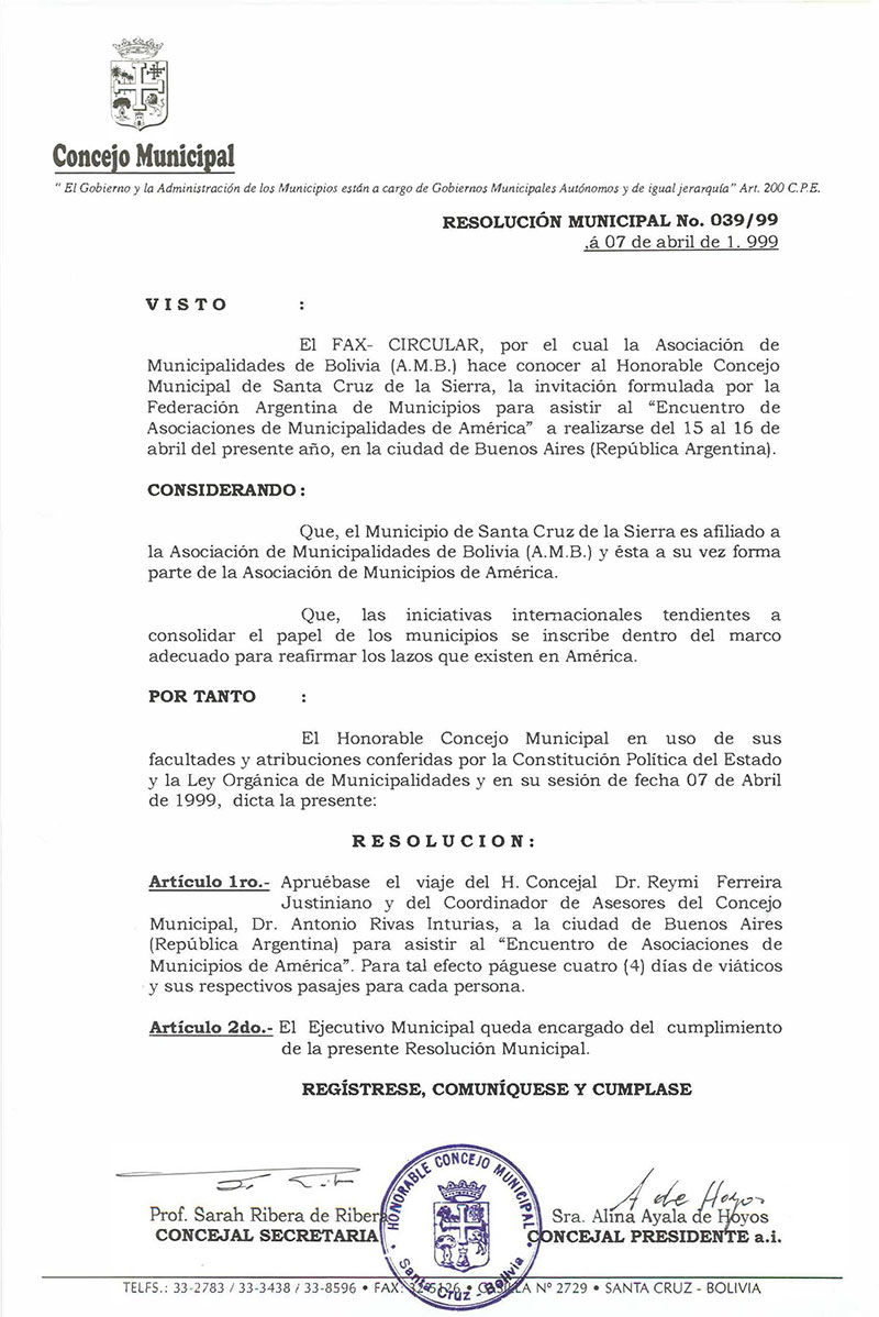 Apruébase el viaje del Concejal Reymi Ferreira Justiniano y del Asesor Antonio Rivas Inturias a la ciudad de Buenos Aires - Argentina, para asistir al “Encuentro de Asociaciones de Municipios de América”.