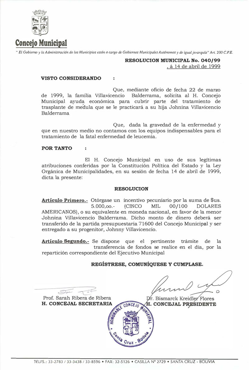 Otorga un incentivo de $us. 5.000.- en favor de la menor Johnina Villavicencio Balderrama, para tratamiento de transplante de médula.