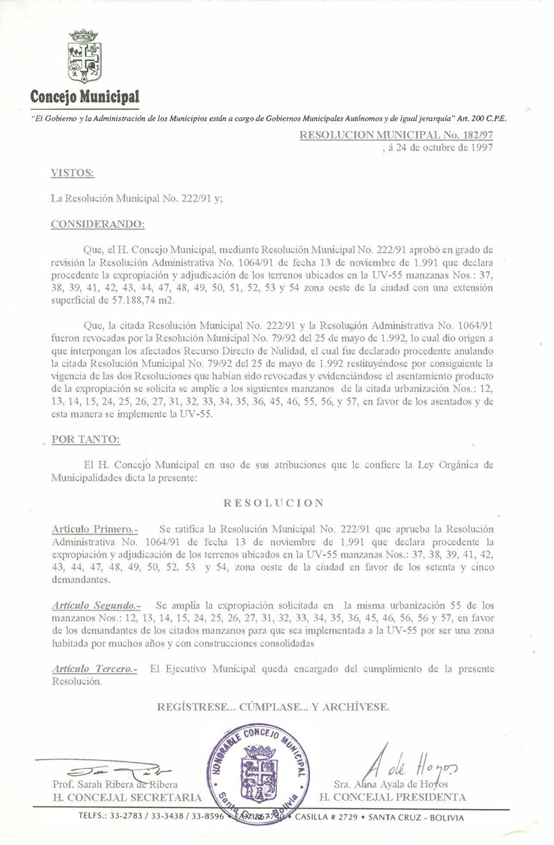 Se ratifica la Resolución Municipal No. 222/91 que aprueba la Resolución Administrativa No. 1064/91 de fecha 13 de noviembre de 1.991 que declara procedente la expropiación y adjudicación de los terrenos ubicados en la UV-55 manzanas Nos.: 37, 38, 39, 41, 42, 43, 44, 47, 48, 49, 50, 52, 53 y 54, zona oeste de la ciudad en favor de los setenta y cinco demandantes
