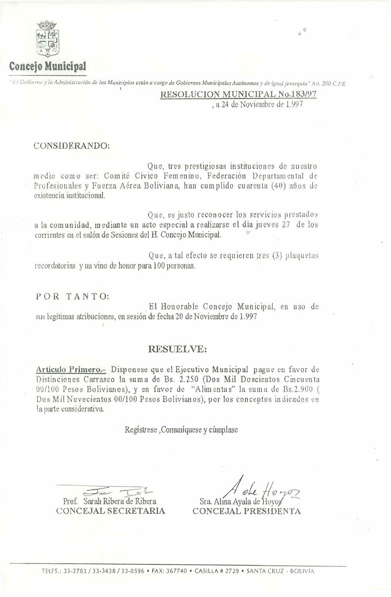 Dispone que el Ejecutivo Municipal pague en favor de Distinción Carrasco la suma de Bs. 2.250 (Dos Mil Doscientos Cincuenta 00/100 Pesos Bolivianos), y en favor de "Alimentos" la suma de Bs.2.900 ( Dos Mil Novecientos 00/100 Pesos Bolivianos), por los conceptos indicados en la parte considerativa.