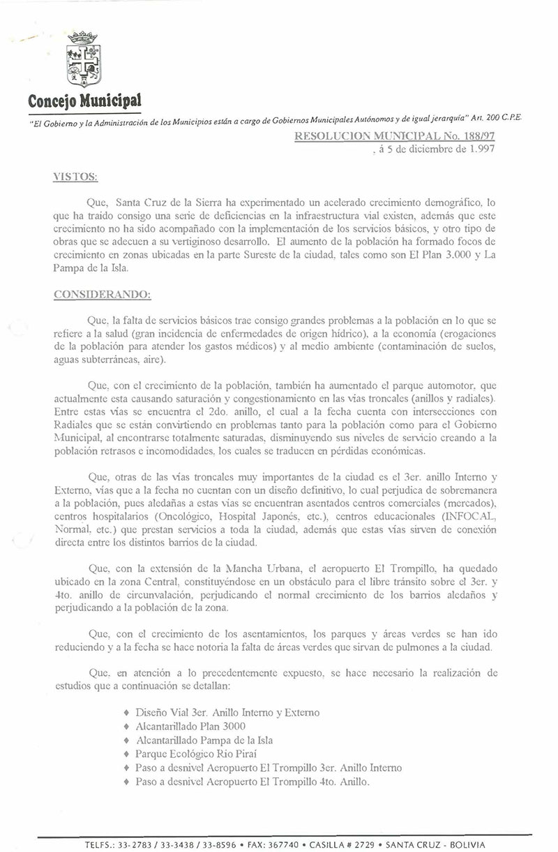 Declara de prioridad la realización y ejecución de los proyectos: Diseño Vial 3er. Anillo Interno y Externo Alcantarillado Plan 3000 Alcantarillado Pampa de la isla Parque Ecológico Río Piraí Paso a desnivel Aeropuerto El Trompillo 3er. Anillo Interno Paso a desnivel Aeropuerto El Trompillo 4to. Anillo