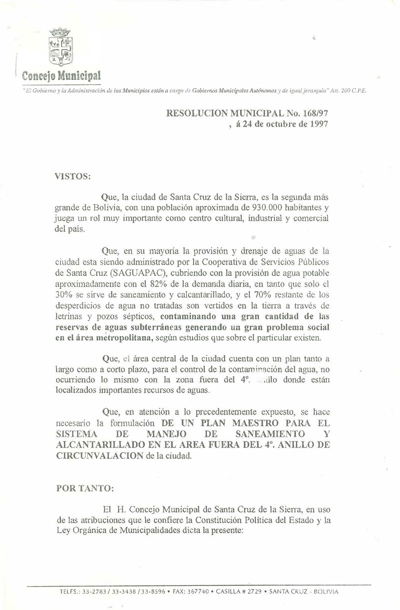 Dispone, la formulación de un Plan para el sistema de manejo de saneamiento y alcantarillado en el área fuera del 4°. anillo de la ciudad.